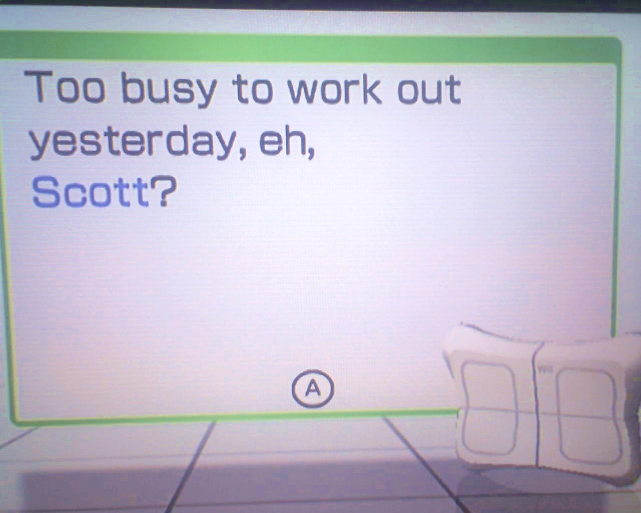 So I had to go to a conference, and how sad is this – I put two towels over a phone book and did the Wii fit step routine for 45 minutes one night.   After the conference, I came home, dreading what I knew was coming.  I turned on the TV, plugged it all up, braced for impact, and was met with my ‘snarky’ welcome home message.