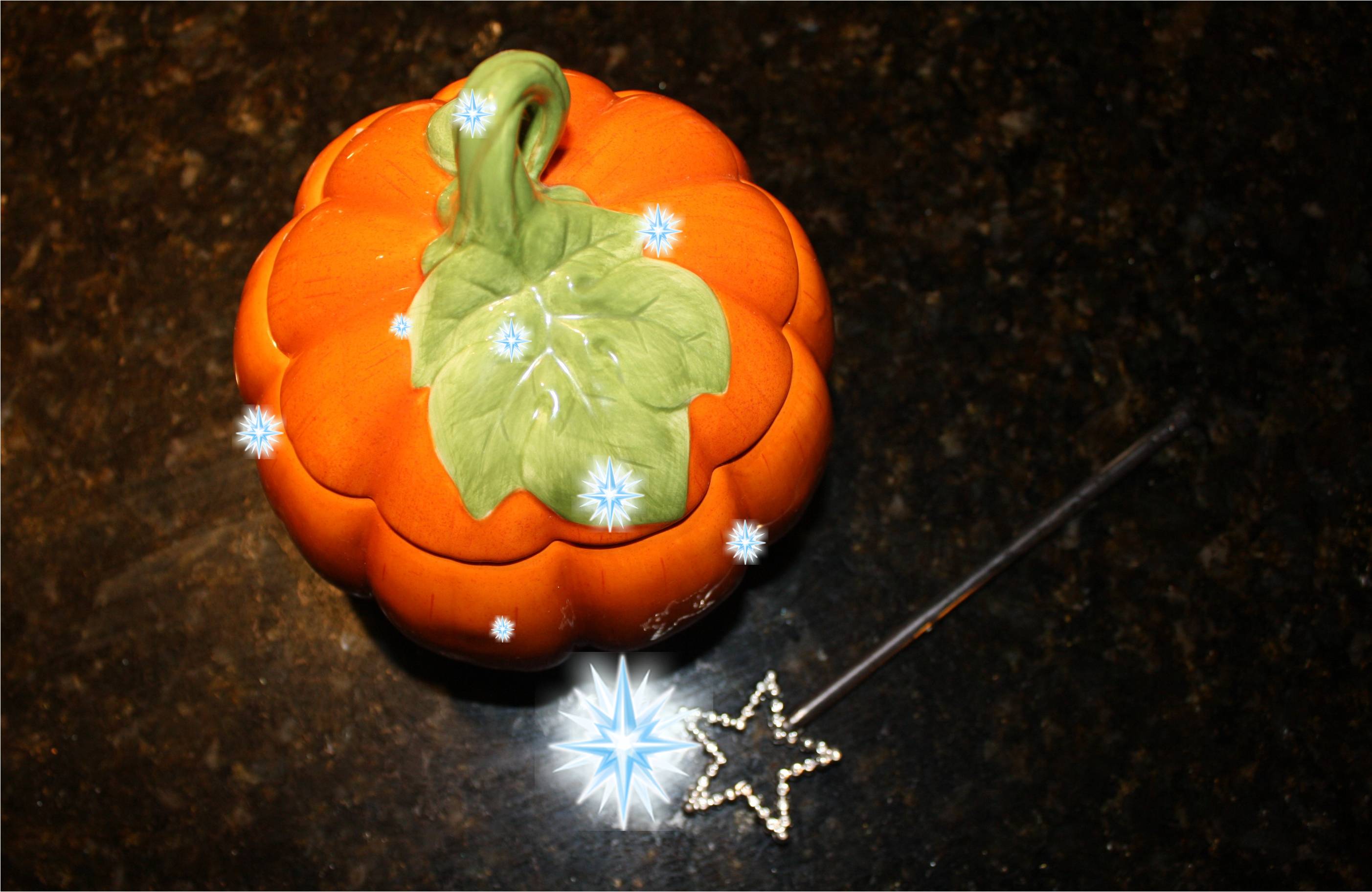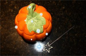 I will never see my pumpkin candle-holder quite the same way again thanks to the fact that for over a week now I have found this while cleaning down my counter tops. She takes this wand everywhere with her, but somehow, at the end of the day, it winds up right where she feels it should be . . . with the magic pumpkin (candle) of course.
